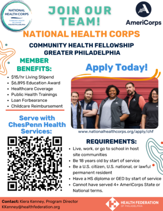 ChesPenn is partnering with the National Health Corps, Americorps, and the Health Federation to offer a position as a digital navigator at our Upper Darby health center.